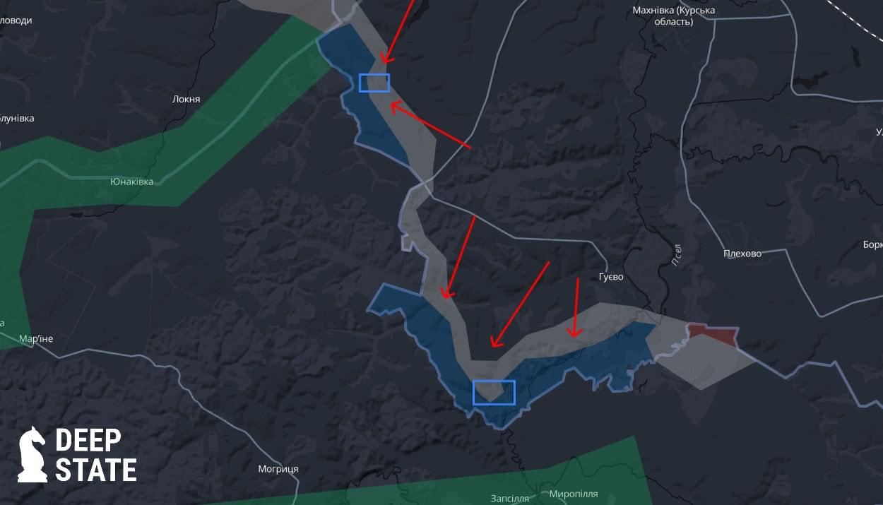 В то же время украинский военный паблик Deep State пишет, что россияне практически полностью заняли село Горналь и продвинулись в районе Олешни (по стрелкам на карте).