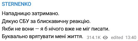 При этом он отметил, что нападавшей была женщина, которую уже задержала Служба безопасности Украины.