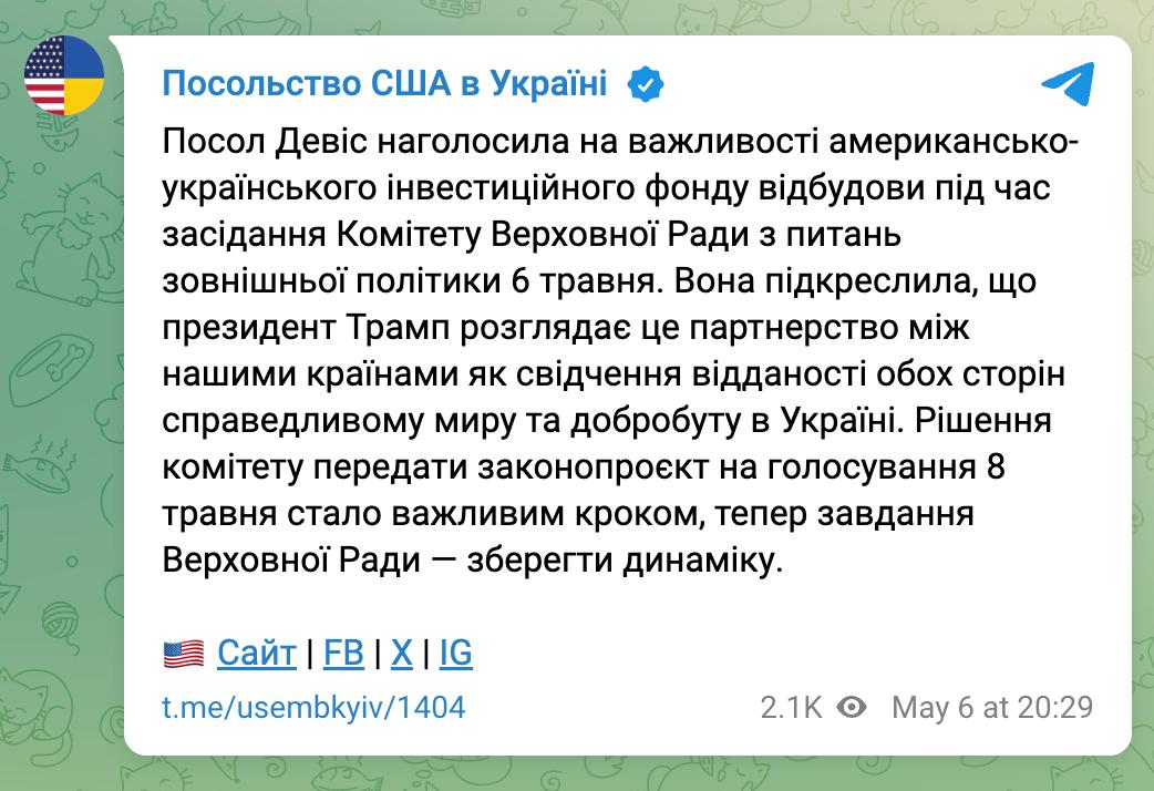 "Решение комитета передать законопроект на голосование 8 мая стало важным шагом, теперь задача Верховной Рады сохранить динамику", - сказано в публикации посольства в Телеграме.