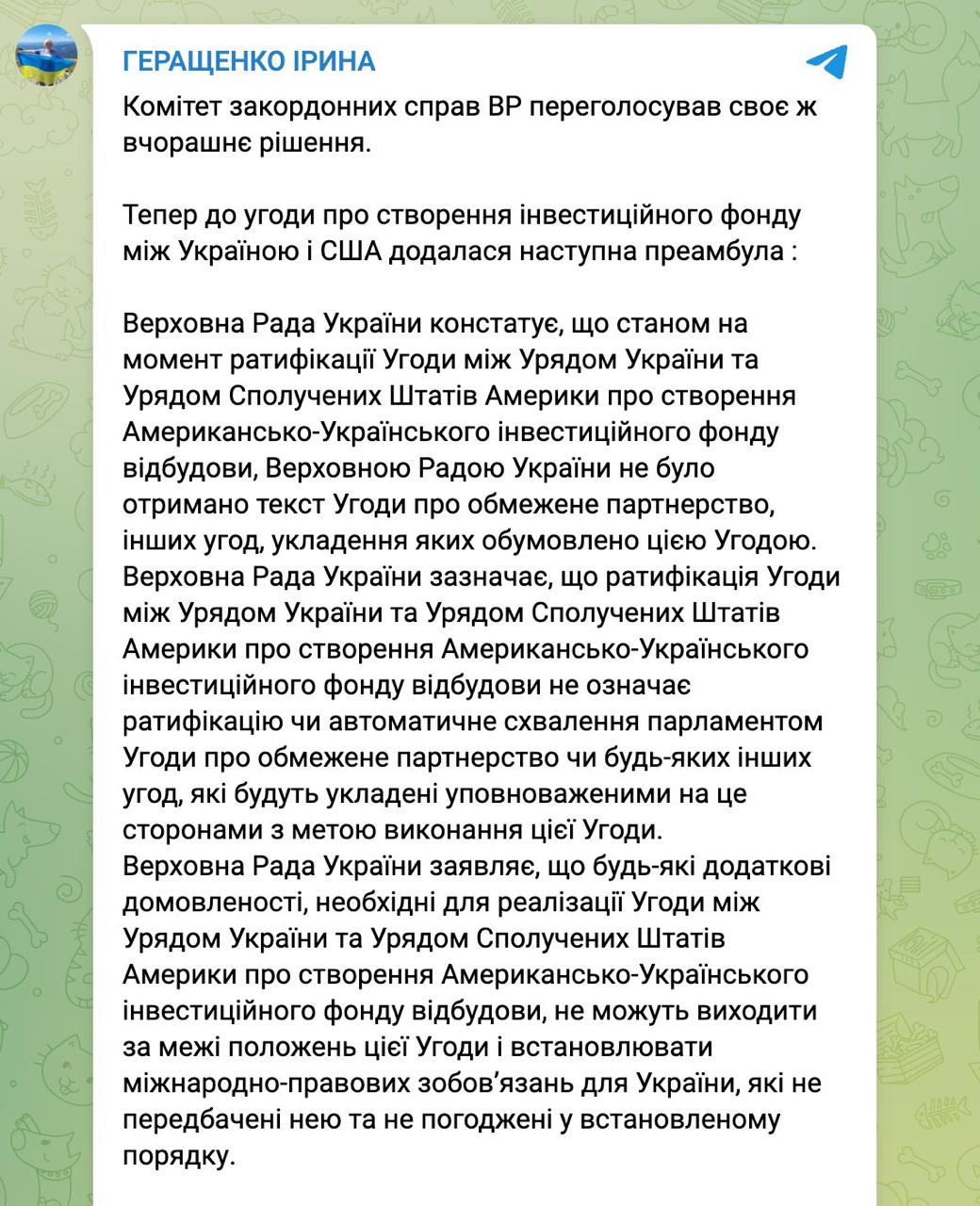 Об этом сообщает в своем телеграм-канале народный депутат Ирина Геращенко.