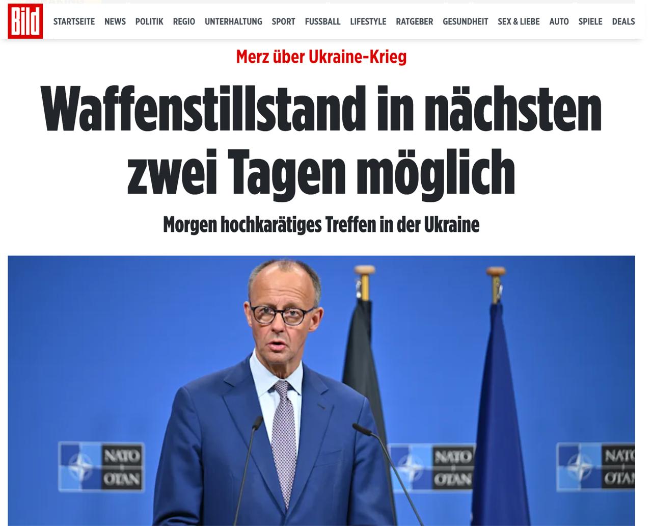 Bild пишет, что новый канцлер ФРГ пообщался с президентом США Дональдом Трампом, встретился с генеральным секретарем НАТО Марком Рютте, а также посетил президента Франции Эмманюэля Макрона и премьер-министра Польши Дональда Туска. Вместе Макроном, Туском и премьер-министром Великобритании Киром Стармером он написал совместное коммюнике, которое "в значительной степени идентично" мирным  предложениям США.