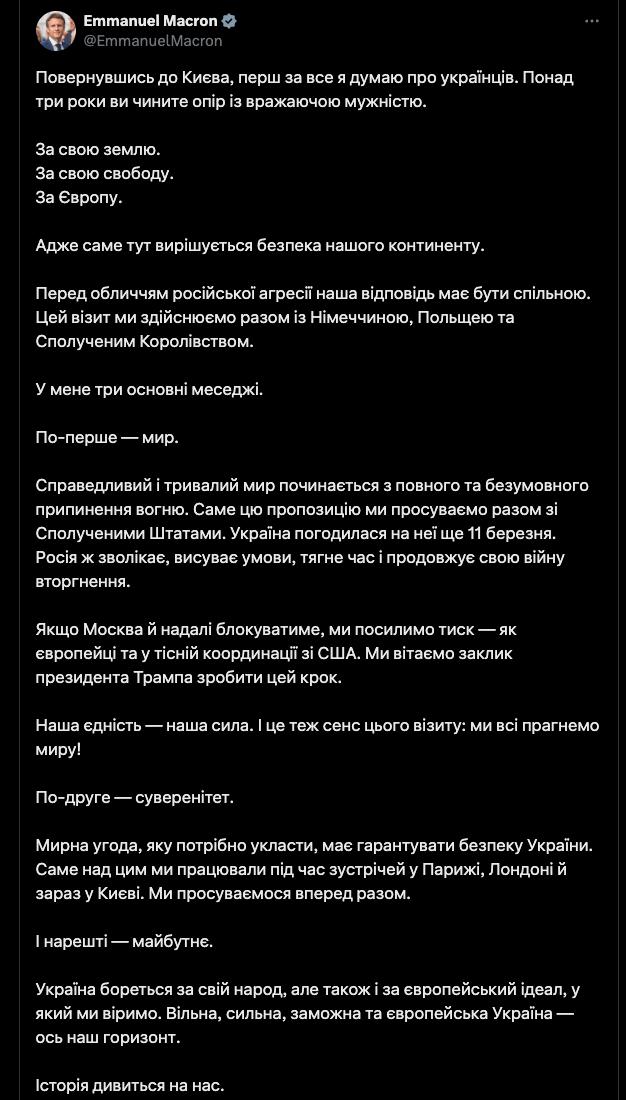 Об этом написал президент Франции Эмманюэль Макрон на своей странице в Х, комментируя сегодняшний визит в украинскую столицу.