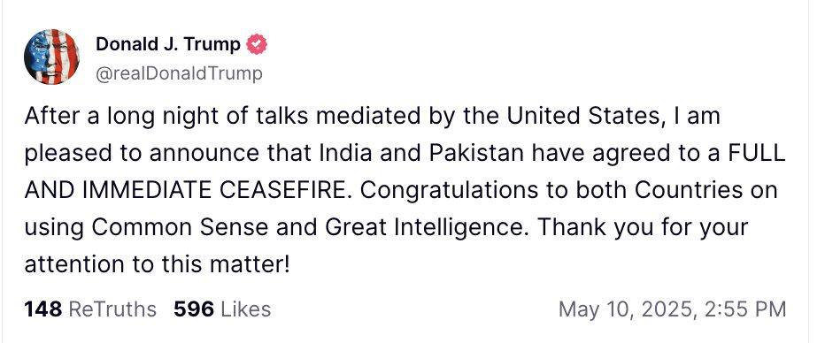 "После долгой ночи переговоров при посредничестве США я рад объявить, что Индия и Пакистан договорились о полном и незамедлительном прекращении огня. Поздравляю обе страны с тем, что проявили здравый смысл и высокий уровень разумности", - написал Трамп.