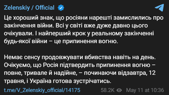 "Это хороший знак, что россияне наконец-то задумались об окончании войны. Все в мире уже очень давно ожидали этого. Нет смысла продолжать убийства даже на день. Ожидаем, что Россия подтвердит прекращение огня – полное, длительное и надежное – начиная с завтрашнего дня, 12 мая, и Украина готова встречаться", - заявил Зеленский.