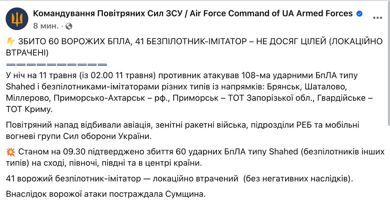 Как заявляют Воздушные силы ВСУ, этой ночью сбито 60, еще 41 "локационно утрачен" без последствий. Прилеты были в Сумской области.