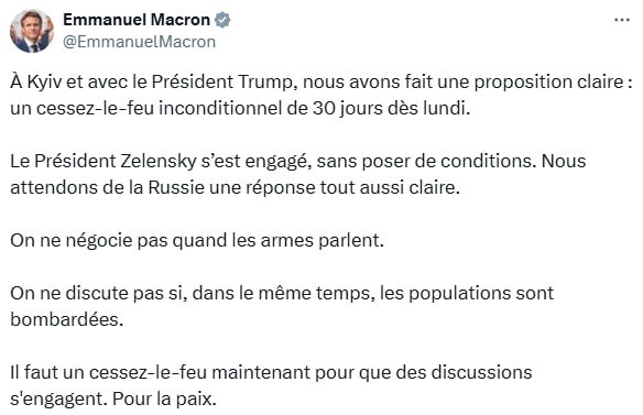"Президент Зеленский взял на себя обязательства, не ставя никаких условий. Теперь мы ожидаем такого же четкого ответа от России. Не может быть переговоров, когда говорит оружие. Не может быть диалога, когда в то же время бомбардируют мирных жителей. Сейчас нужно прекращение огня, чтобы переговоры могли начаться", - написал Макрон.