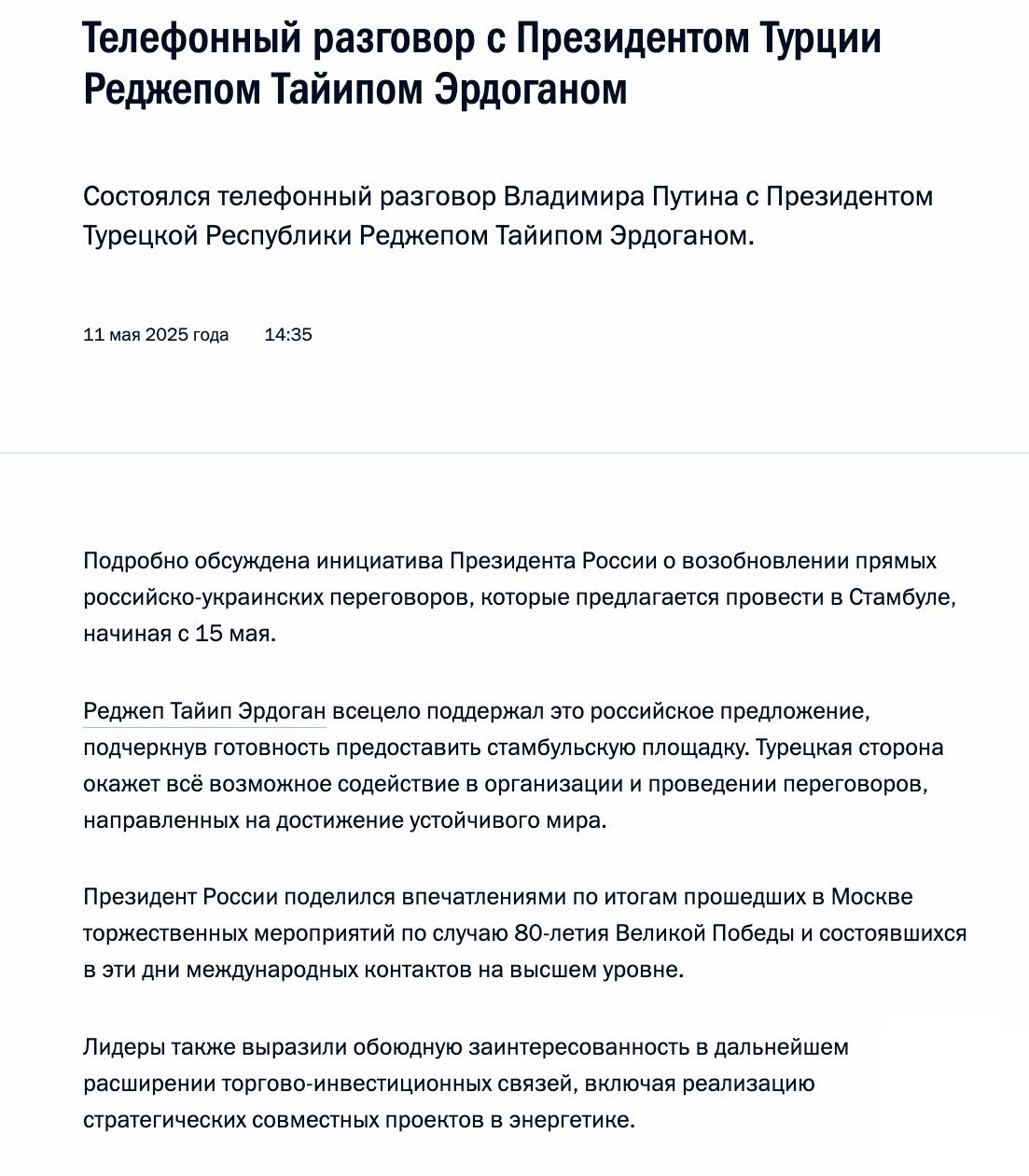 В сообщении говорится, что в разговоре «подробно обсуждена инициатива президента России о возобновлении прямых российско-украинских переговоров, которые предлагается провести в Стамбуле, начиная с 15 мая».