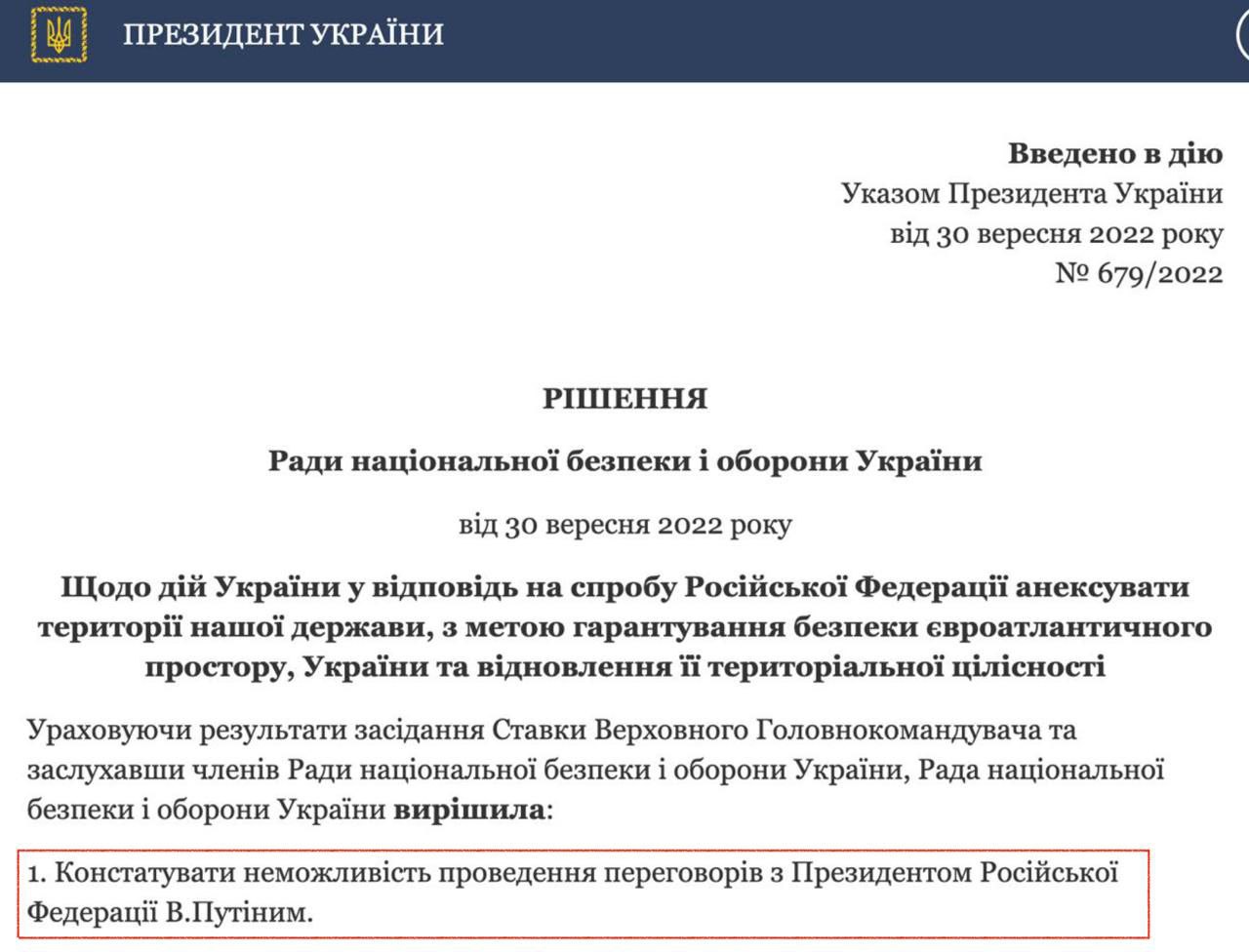 Этот указ ввел в действие СНБО, где первым пунктом постановляется: "Констатировать невозможность переговоров с Президентом Российской Федерации В.Путиным".