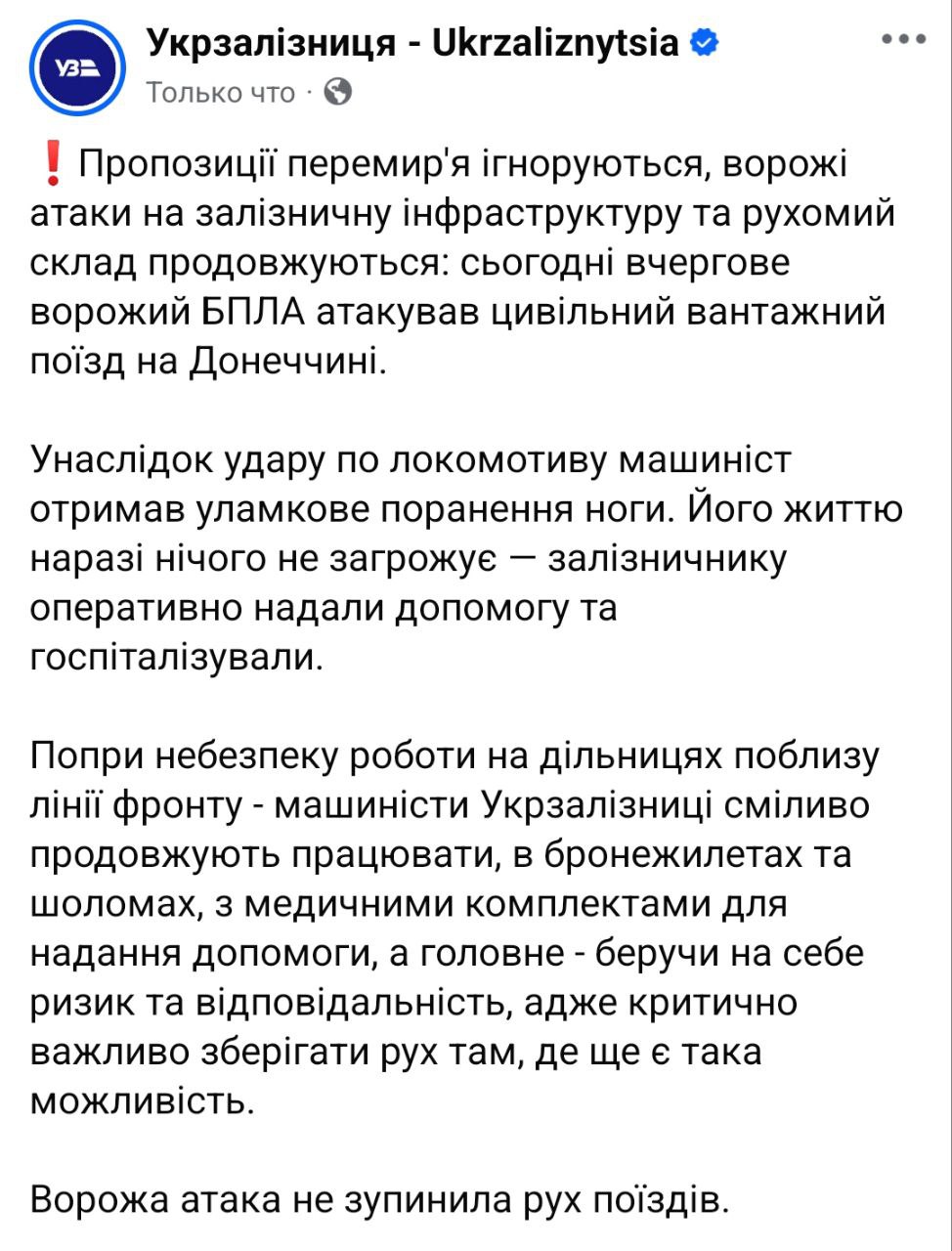 7.40 Российский дрон ударил по грузовому поезду в Донецкой области, сообщает "Укрзализныця". Ранен машинист.