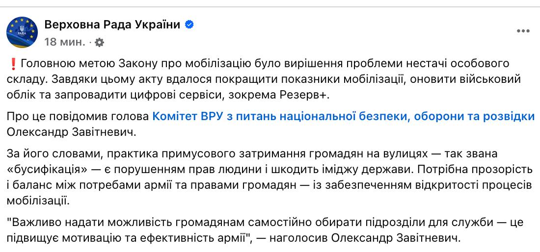 Пресс-служба парламента привела слова Завитневича о том, что принудительные задержания людей на улицах в виде бусификации – это нарушение прав человека, которое вредит имиджу государства.