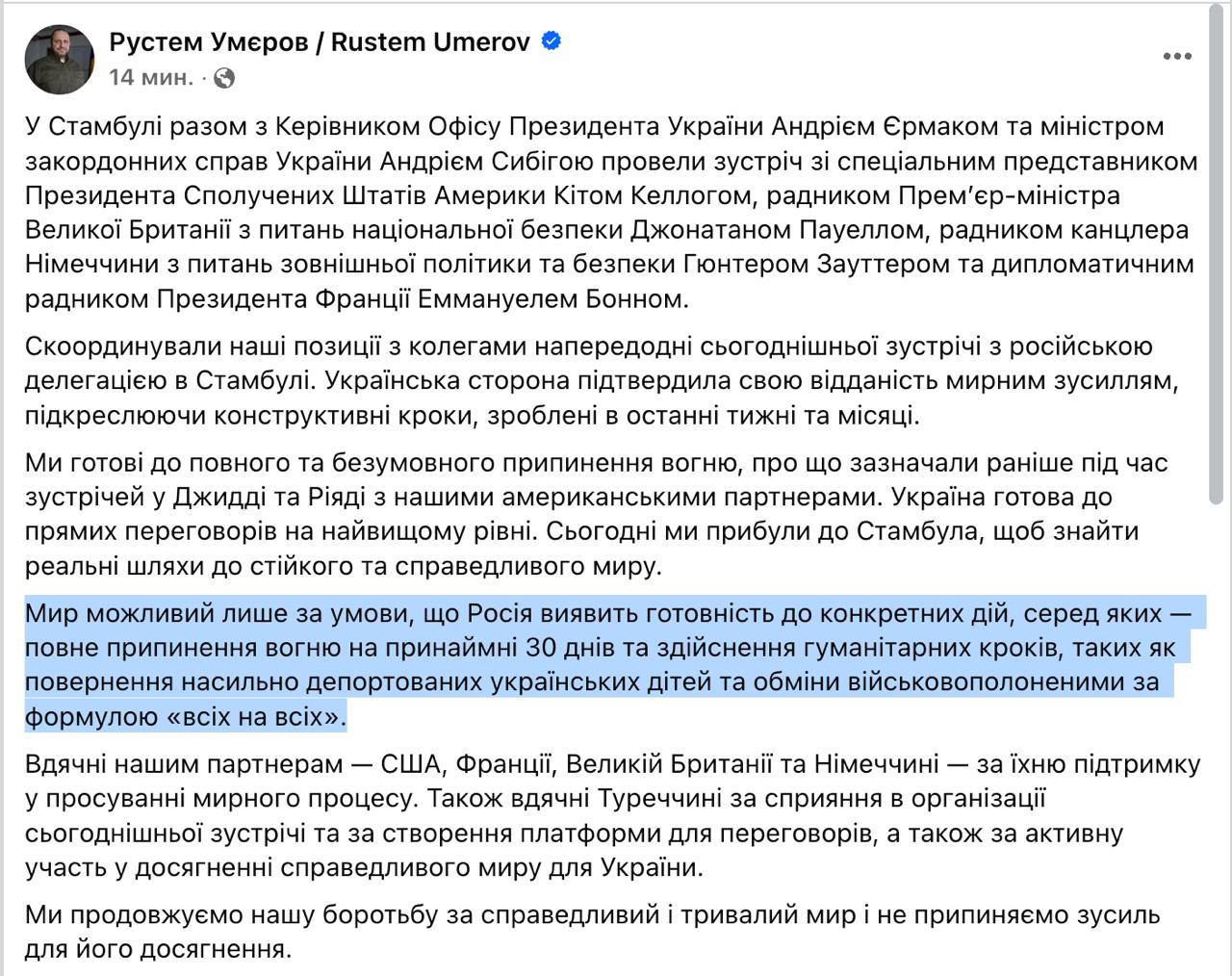 "Мир возможен только при условии, что Россия проявит готовность к конкретным действиям, среди которых полное прекращение огня по крайней мере 30 дней и осуществление гуманитарных шагов, таких как возвращение насильственно депортированных украинских детей и обмены военнопленными по формуле «всех на всех", - написал министр обороны после встречи с представителями Европы и США.