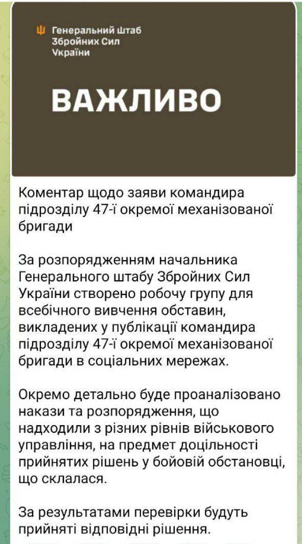 "По распоряжению начальника Генерального штаба Вооруженных Сил Украины создана рабочая группа для всестороннего изучения обстоятельств, изложенных в публикации командира подразделения 47-й отдельной механизированной бригады в социальных сетях", - заявили в пресс-службе.