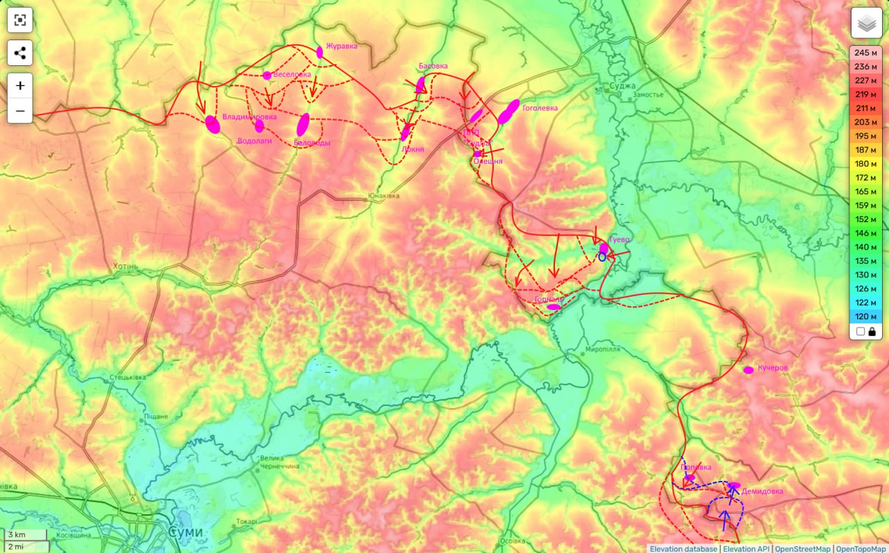 Кроме того, РФ удерживает участки местности севернее села Владимировка в Сумской области глубиной до 1,2 км (западнее Водолаг) и в районе Александровского гидрологического заказника глубиной до 1,7 км (северо-восточне Сум, через границу от курского села Гуево).
