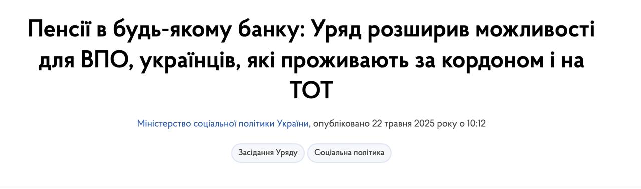 14:24 Украинские переселенцы, жители на оккупированных территориях и выехавшие с них за границу теперь смогут получить пенсию не только в "Ощадбанке", но и в других уполномоченных банках или через "Укрпочту", сообщает Кабмин.
