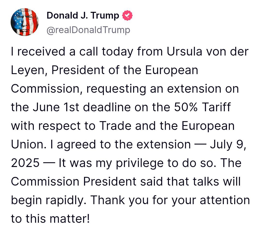 Трамп заявил, что перенес срок введения пошлин с 1 июня на 9 июля.