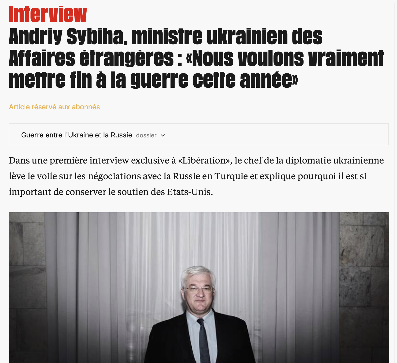 Об этом заявил глава Министерства иностранных дел Андрей Сибига во время интервью Libaration.