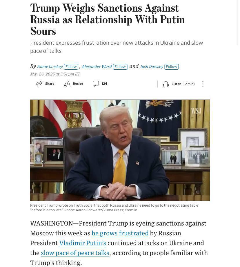 7.13 Президент США Дональд Трамп "присматривается к введению санкциям против Москвы на этой неделе", поскольку он расстраивается из-за продолжающихся атак РФ по Украине и медленных темпов мирных переговоров, пишет The Wall Street Journal со ссылкой на людей, "знакомых с мыслями Трампа".