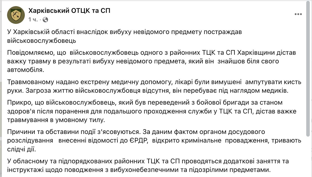 15:31 В Харьковской области сотруднику ТЦК оторвало руку взрывом, сообщает областной военкомат.