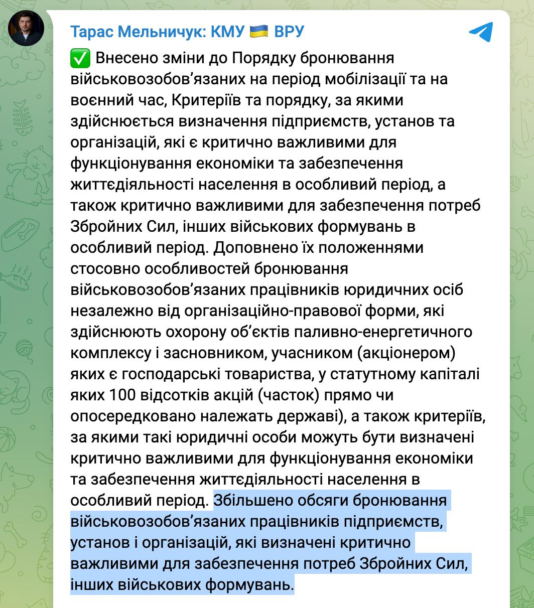 15:06 Кабмин увеличил объемы бронирования для предприятий, определенных критически важными для обеспечения потребностей ВСУ.
