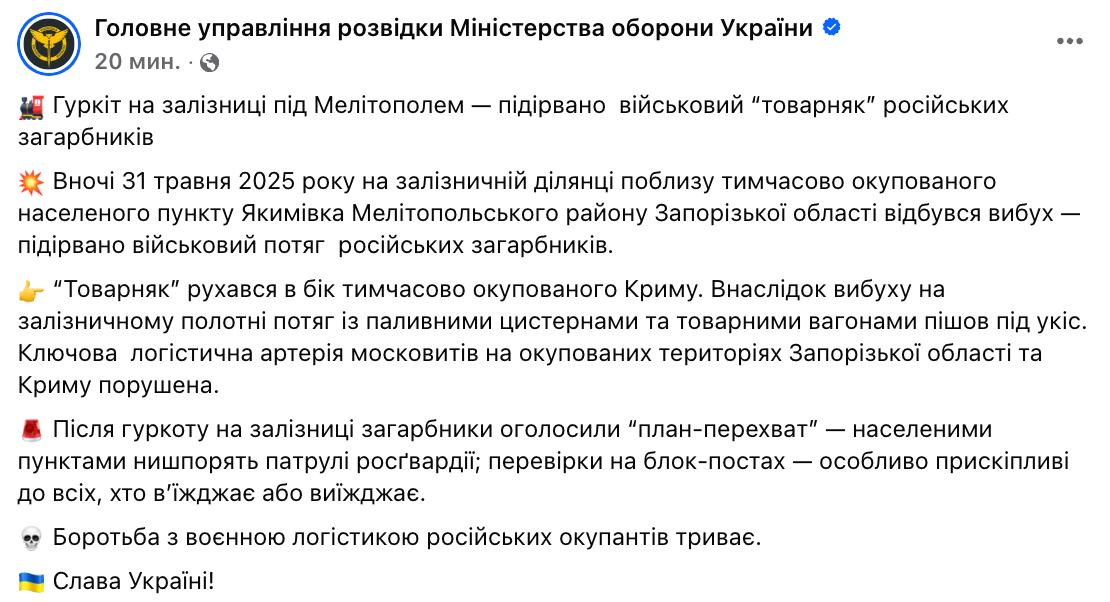 ""Товарняк" двигался в сторону временно оккупированного Крыма. В результате взрыва на железнодорожном полотне поезд с топливными цистернами и товарными вагонами пошел под откос. Ключевая логистическая артерия московитов на оккупированных территориях Запорожской области и Крыма нарушена", - говорится в сообщении.