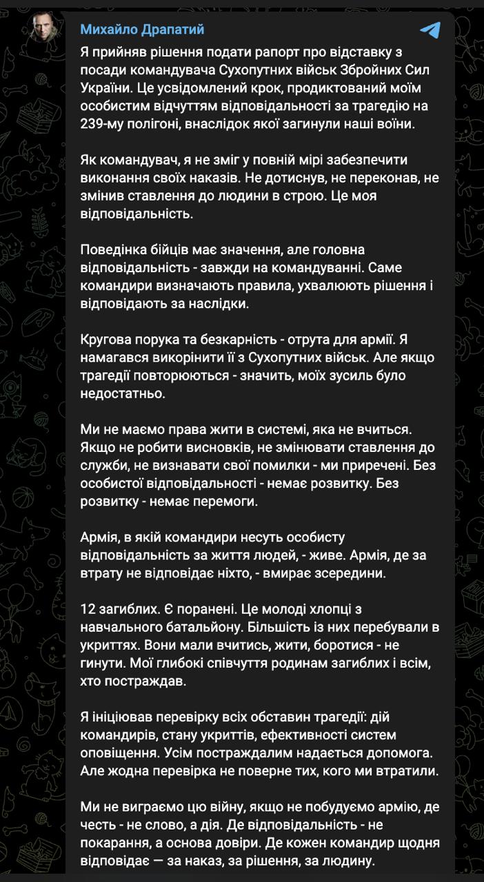 "Круговая порука и безнаказанность – яд для армии. Я пытался искоренить ее из Сухопутных войск. Мы не имеем права жить в системе, которая не учится. Армия, в которой командиры несут личную ответственность за жизнь людей, – живет. Армия, где за потерю не отвечает никто, – умирает изнутри", - заявил военный.
