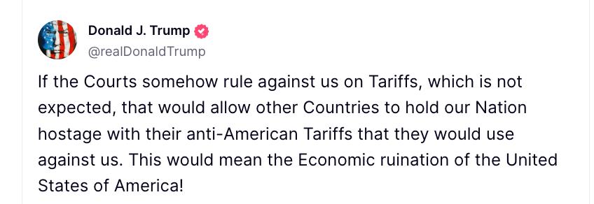 "Если суды каким-то образом вынесут решение против нас по тарифам, чего не ожидается, это позволит другим странам держать нашу страну в заложниках со своими антиамериканскими тарифами, которые они будут использовать против нас. Это означало бы экономическое разорение Соединенных Штатов Америки!" - написал президент США.
