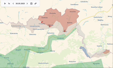 Продвижение во второй половине мая было обусловлено по большей части ускорением наступления россиян по двум направлениям - между Покровском и Торецком, где армии РФ удалось нащупать слабое место в обороне ВСУ и достаточно глубоко порвать фронт. А также в Сумской области.