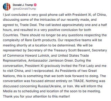 "Мы обсудили некоторые тонкости недавно заключенного и согласованного торгового соглашения. Разговор длился примерно полтора часа и завершился очень позитивным результатом для обеих стран. Теперь не должно быть никаких вопросов относительно сложности производства редкоземельных продуктов. Наши соответствующие команды в ближайшее время встретятся в месте, которое будет определено позднее", - написал Трамп.