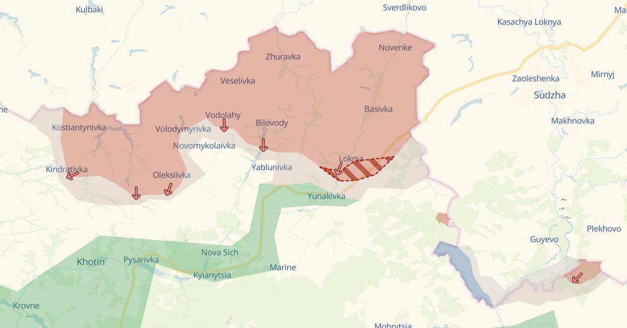 Накануне россияне захватили Кондратовку и Алексеевку и закрепились на трассе Сумы - Суджа выше Юнаковки, сообщает Deep State.