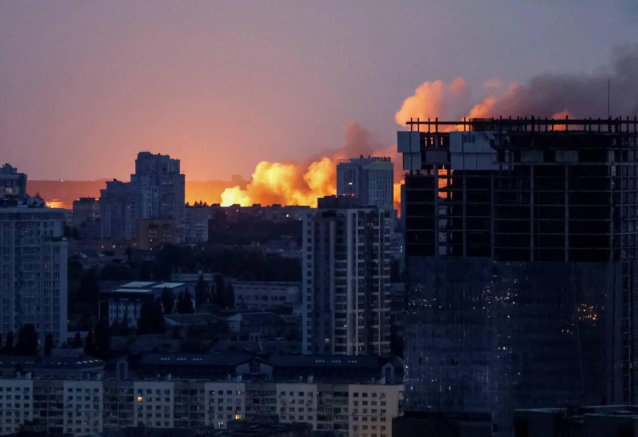 4.48 Киев подвергся ракетно-дроновой атаке. Над городом поднимается огромный столб дыма.