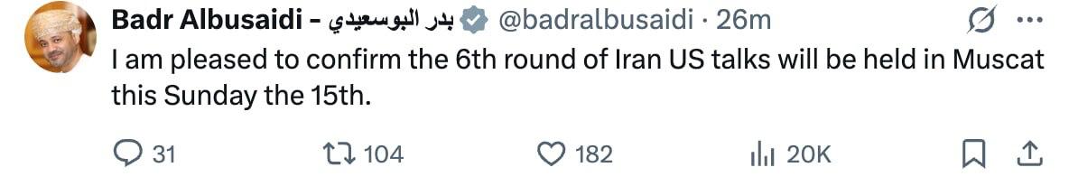 "Я рад подтвердить, что шестой раунд ирано-американских переговоров организуют в Маскате в это воскресенье, 15 июня", - написал он в соцсети X.