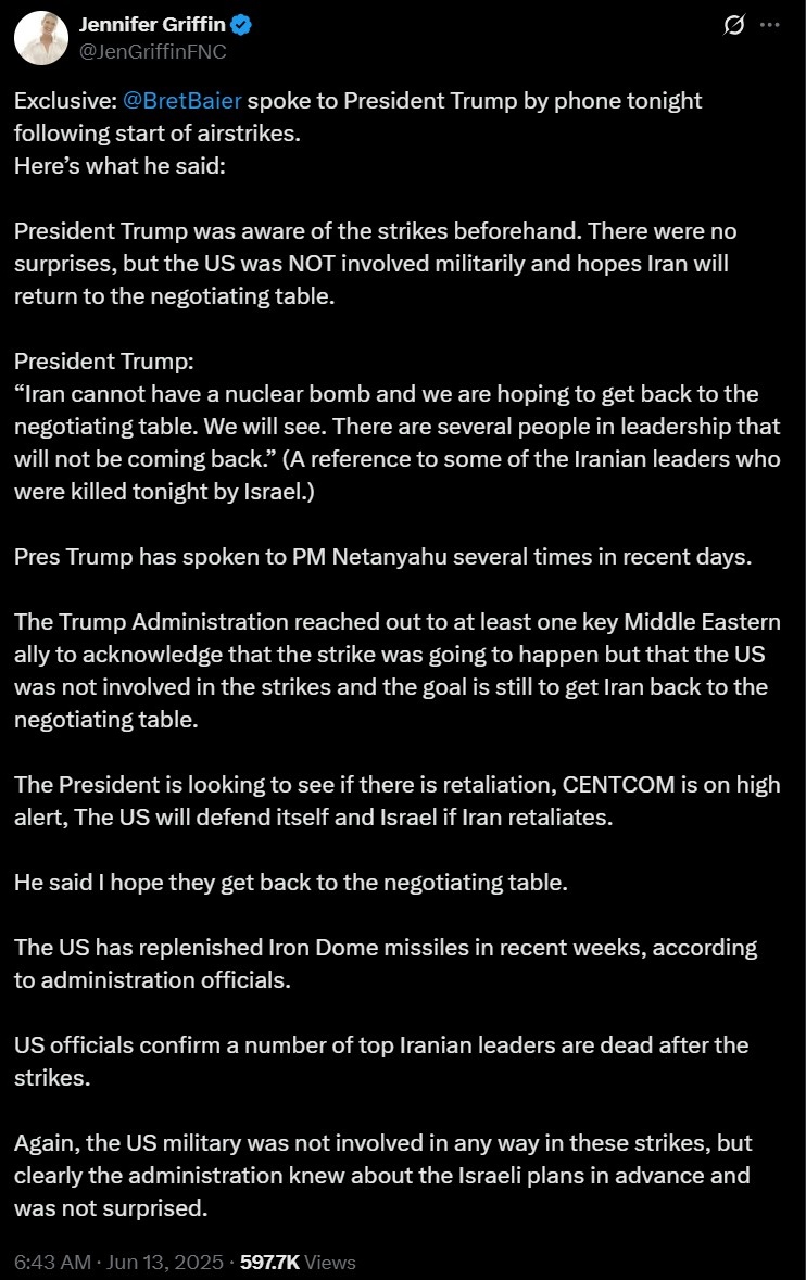 "Иран не может иметь ядерную бомбу, и мы надеемся вернуться за стол переговоров. Посмотрим. Несколько человек из руководства не вернутся", - заявил Трамп, имея в виду некоторых иранских лидеров, убитых сегодня ночью Израилем.