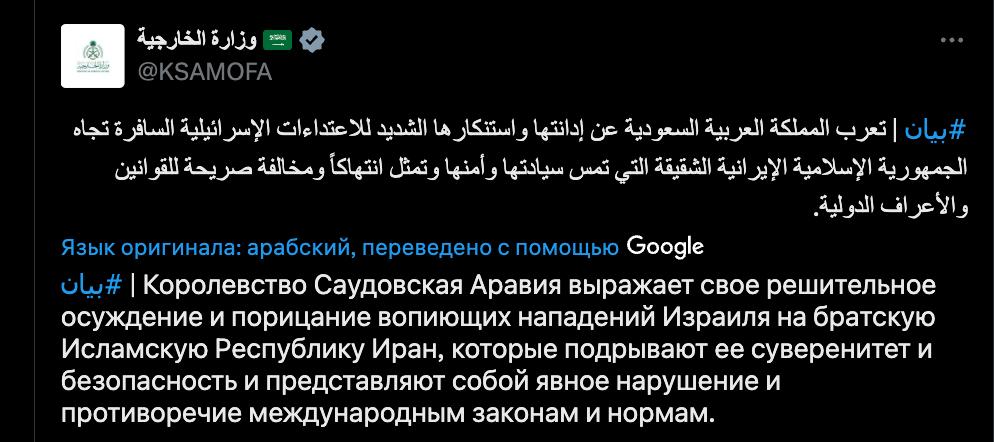 В то же время, Саудовская Аравия осудила нападение Израиля на Иран.