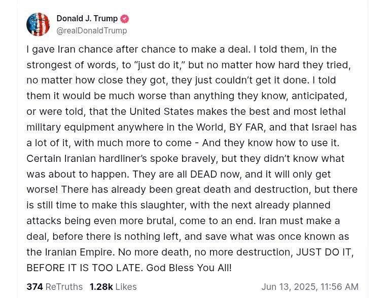 Иран должен заключить сделку, пока ещё есть что спасать от того, что когда-то называлось Иранской империей. Больше никаких смертей, больше никаких разрушений - просто сделайте это, пока не стало слишком поздно. Да благословит вас Бог!" - написал президент США.