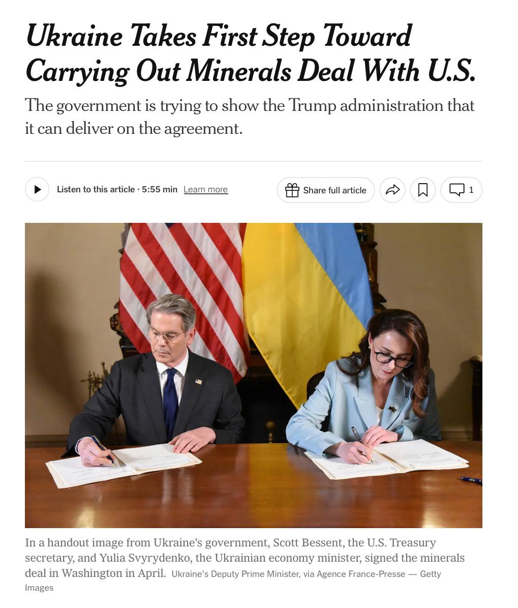 Отмечается, что это первый реальный шаг в рамках недавнего соглашения с США, согласно которому половина доходов от добычи полезных ископаемых будет поступать в совместный американо-украинский фонд.