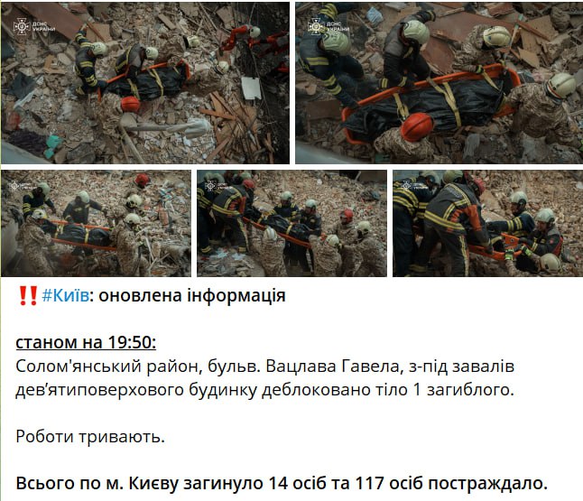 Также ГСЧС сообщает, что в Киеве подтверждена гибель 14 человек. Еще 117 получили ранения.