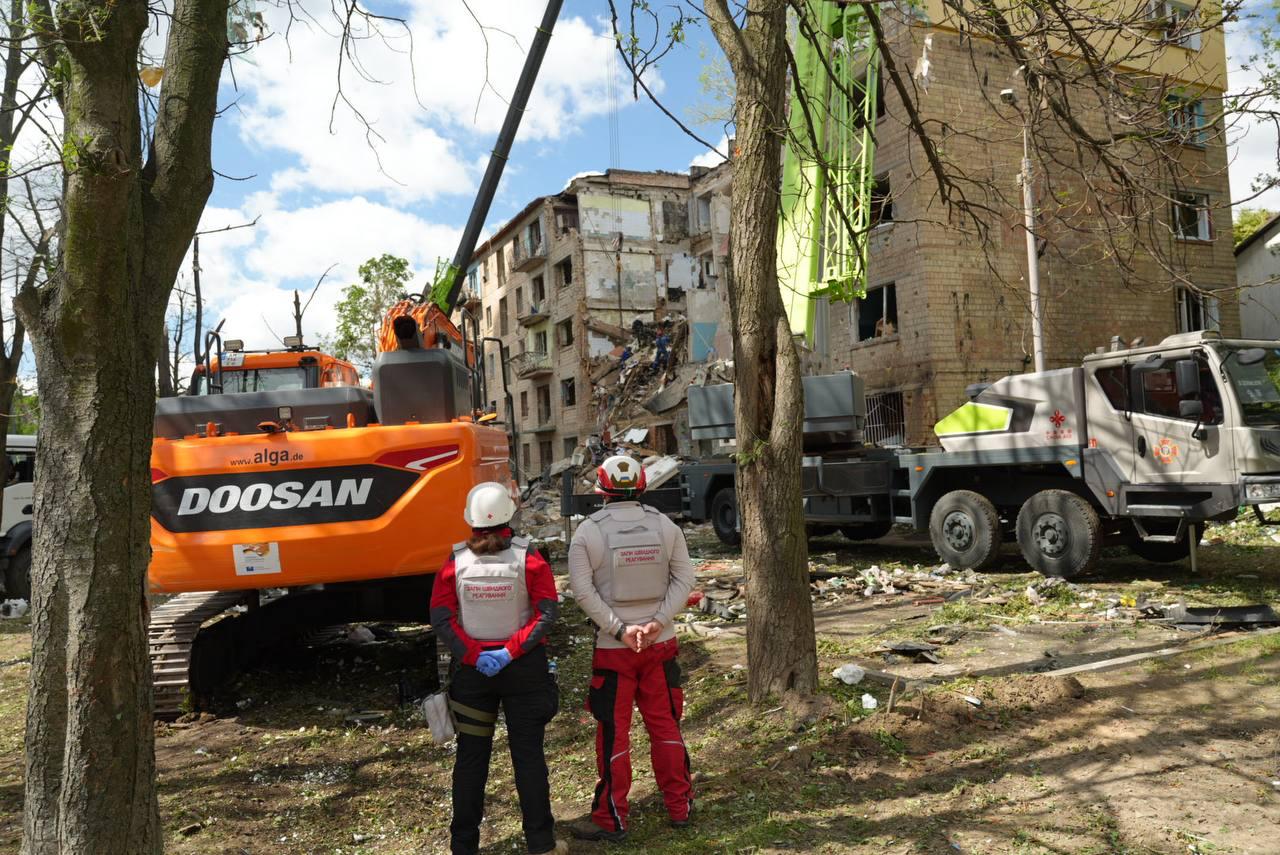 8.57 У дома в Шевченковском районе Киева, где после обстрела обрушился подъезд, продолжается разбор завалов.