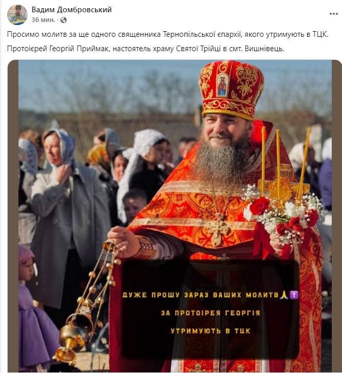 В ТЦК удерживают протоиерея Георгия Приймака, настоятеля храма Святой Троицы в поселке Вишневец, пишут в Фейсбуке диакон Почаевского Свято-Духовского скита Вадим Домбровский и его дочь.