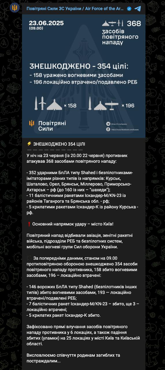 – 352 ударных дрона Shahed и беспилотников-имитаторов различных типов (сбито 146, подавлены средствами РЭБ — 193)