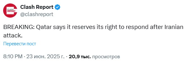 Минобороны Катара заявляет, что катарские системы ПВО успешно отбили ракетную атаку на американскую авиабазу Аль-Удейд. Также Катар заявил, что сохраняет за собой право на ответные действия после удара со стороны Ирана.