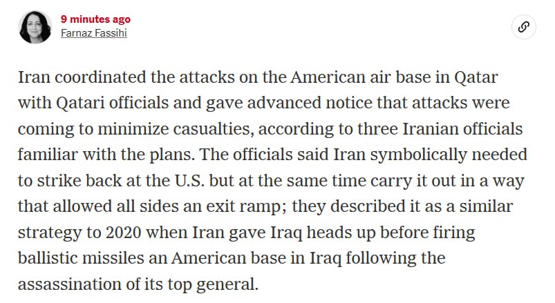 По данным The New York Times, Иран координировал атаки на американскую авиабазу в Катаре с катарскими официальными лицами и заранее уведомил о готовящихся атаках, чтобы свести к минимуму жертвы, сообщают три иранских официальных лица, знакомых с планами.