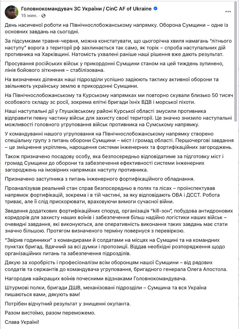"Продвижение российских войск в приграничной зоне Сумщины на этой неделе остановлено, линия боевого соприкосновения — стабилизирована. На определённых участках наши подразделения успешно применяют тактику активной обороны и освобождают украинскую землю в приграничье Сумской области. По итогам мая-июня можно констатировать, что нынешняя волна попыток "летнего наступления" врага с территории РФ захлёбывается так же, как и в прошлом году - тогда это была попытка наступательных действий противника на Харьковщине", - пишет Сырский.