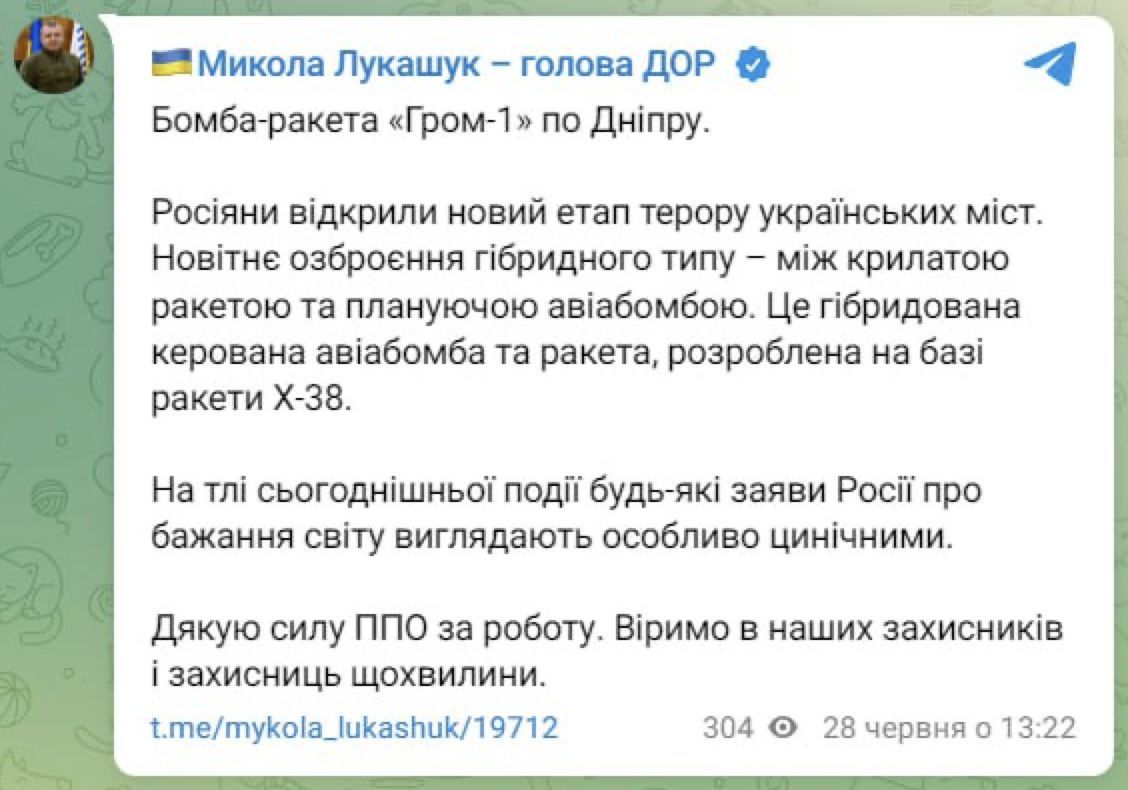 15:13 Новейшая бомба-ракета "Гром-1", которую сбили над Днепром, – это гибрид бомбы и ракеты, созданный на базе ракеты Х-38, сообщил глава Днепропетровского облсовета Лукашук в своем тг-канале.