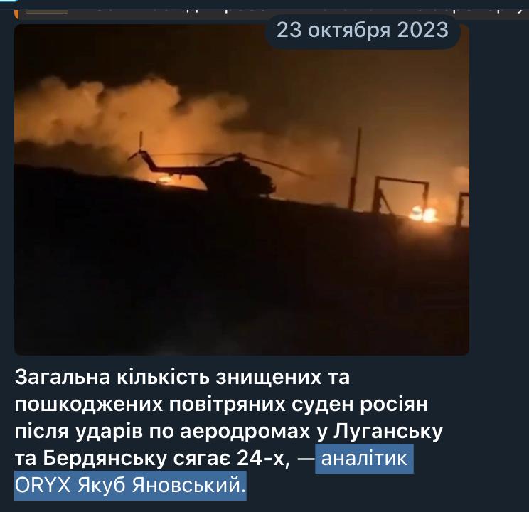 16:10 СБУ заявляет об уничтожении российского ЗРК "Панцирь-С1" и трех вертолетов на крымском аэродроме "Кировское".