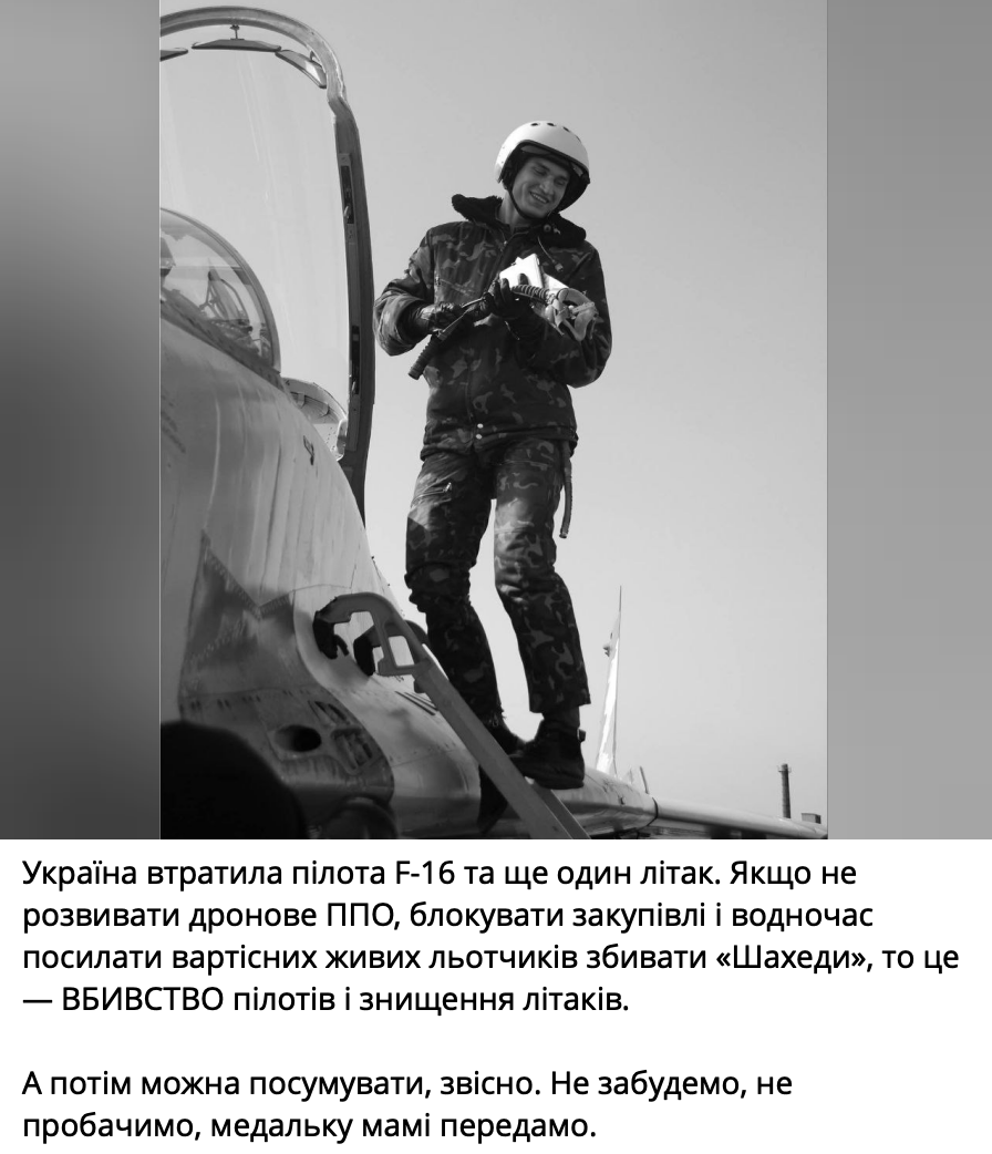 Напомним, сегодня ночью, отбивая массированную воздушную атаку РФ, на самолете F-16 погиб лётчик 1-го класса подполковник Максим Устименко.