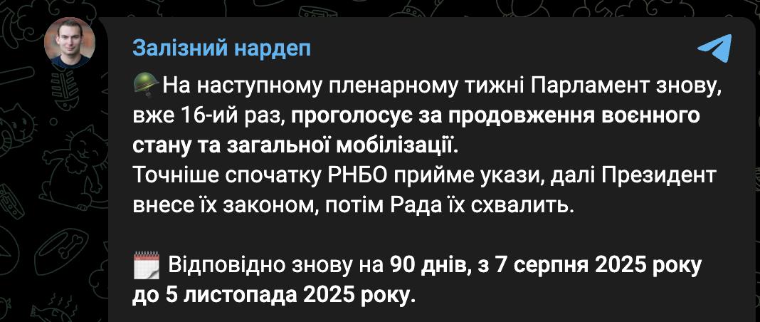 Верховная Рада Украины на следующей пленарной неделе в 16-й раз проголосует за продление военного положения и общей мобилизации.