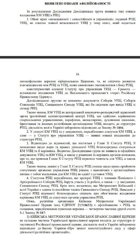При этом объем предоставленных УПЦ прав независимости и самостоятельности в управлении "не означает полной независимости" этой церкви в том виде, который предоставляется автокефальным церквям кириархальной церковью (церковно-правовое понятие кириархальной церкви относится ко взаимоотношениям между поместными церквами, одна из которых имеет автокефальный статус, а другая – автономный; автономные церкви находятся в канонической зависимости от автокефальной (кириархальной) церкви). А у уставе об управлении УПЦ "имеются признаки вхождения в структуру РПЦ". Также уставом Русской православной церкви предусмотрено, что украинские архиереи являются членами поместного и архиерейского соборов РПЦ.
