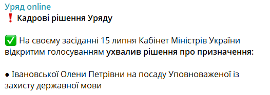 В Кабмине отметили, что решение о назначении Ивановской языковым омбудсменом приняли путем открытого голосования.