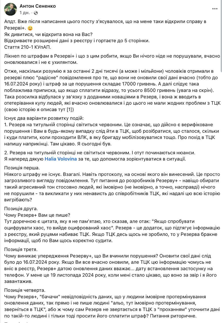 Екатерина Черногоренко, замминистра обороны, на вопросы пользователей об этих штрафах отвечает, что "похоже, что информации об уточнении ваших данных нет в реестре "Оберег". Обратитесь в ТЦК с этим вопросом. Если вы действительно уточнили данные вовремя, не нужно подавать заявление (о признании человеком нарушения. - Ред.) и платить штраф", - пишет Черногоренко.