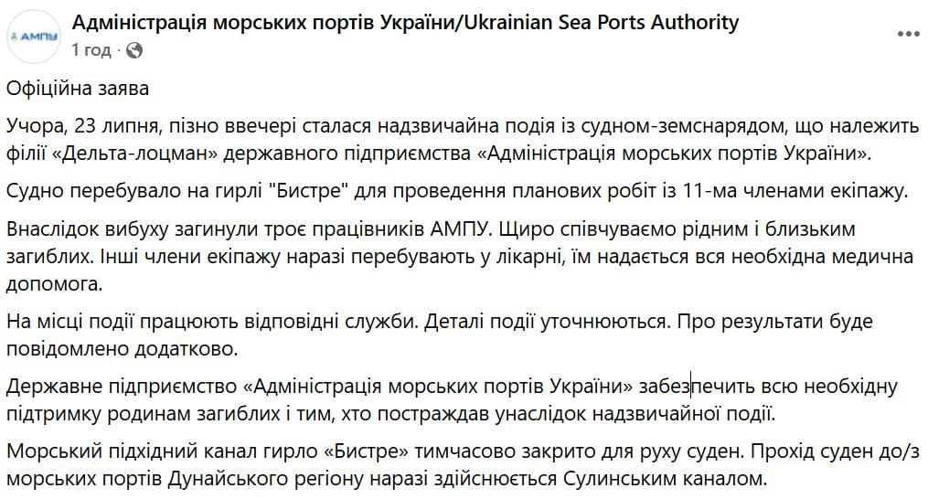 Земснаряд подорвался в устье "Быстрое", где проводил плановые работы. На борту были 11 человек, некоторые получили ранения сообщает Администрация морских портов.